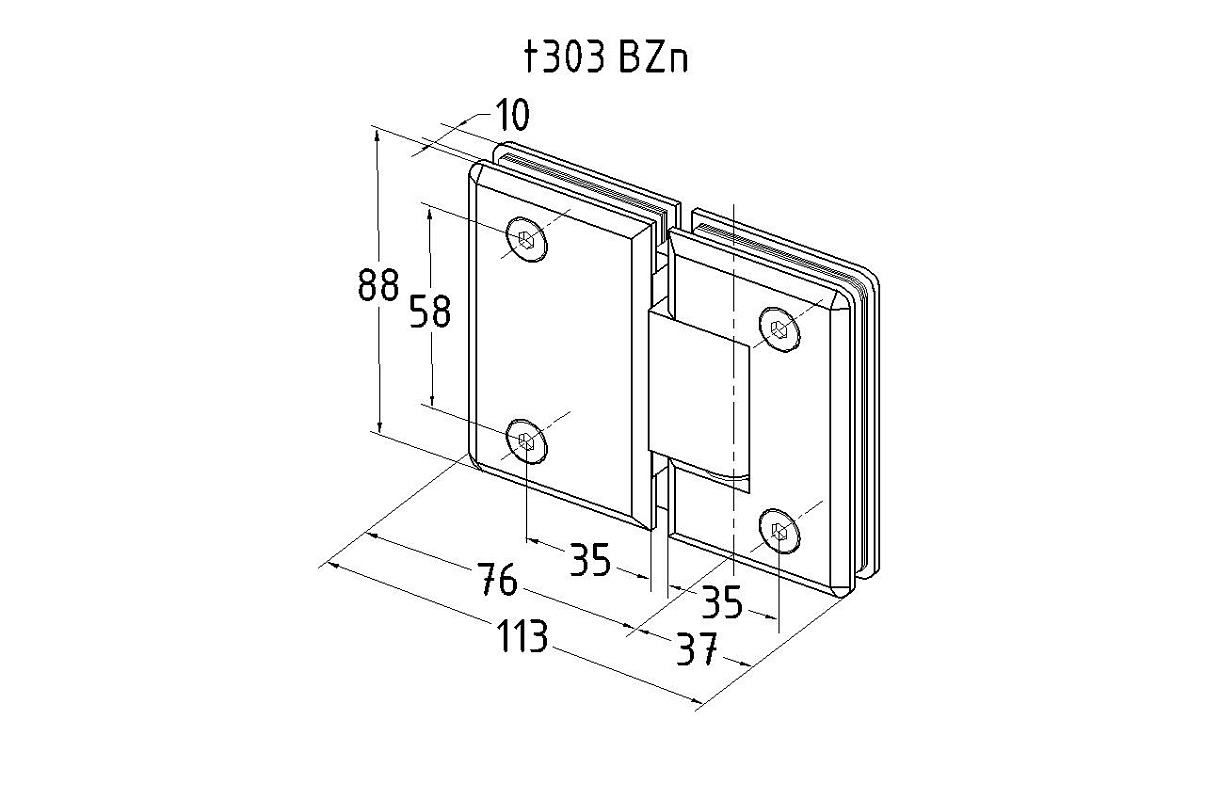 Петля стекло-стекло для соединения стеклянной двери с неподвижным стеклом под углом 180°. Поворот петли в обе стороны с фиксацией на 90º. Масса двери может составлять до 35 кг на две петли.