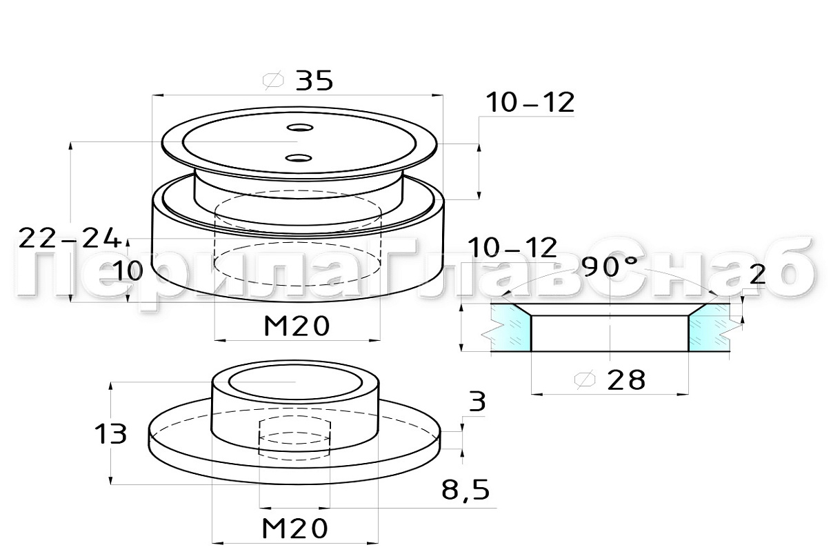 Комплект торцевого крепления несущего стекла, шпилька М16 AISI304, гайка-шайба Ø50х10мм, с регулировкой вылета 25-39мм, полированный, AISI 304 k277-11