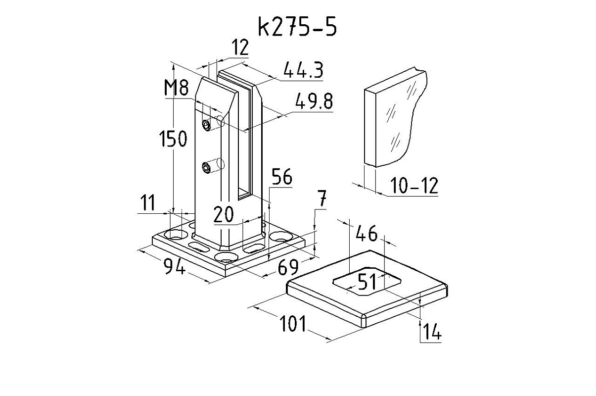 стеклодержатель предназначен для создания ограждений со стеклом 10-12 мм С-8085-2 у бассейнов и кровли. Внутренние вставки в стеклодержателе приклеены, можно отклеить самостоятельно.