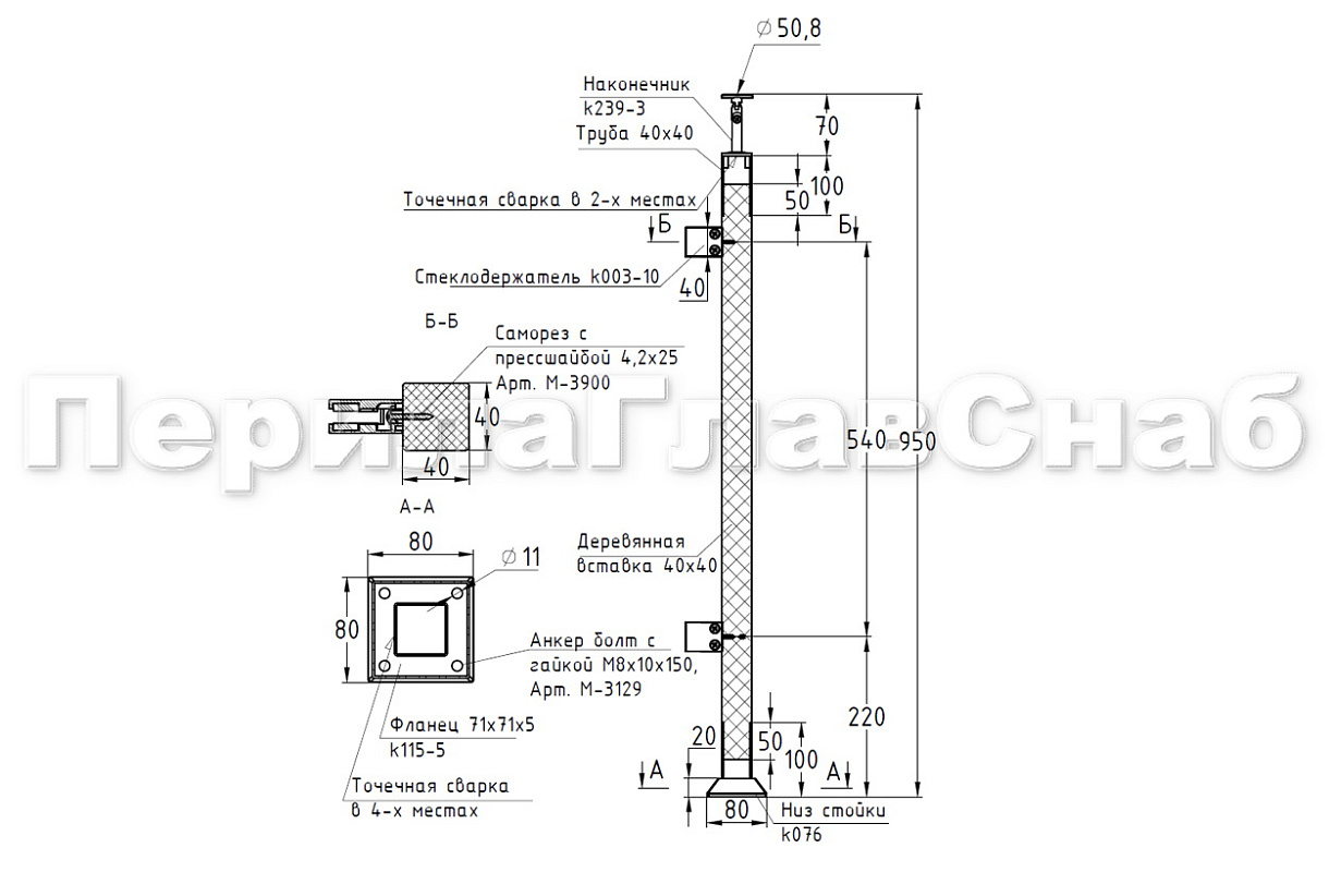 Готовая стойка 40х40х950 мм, деревянная, со вставками из нержавеющей стали 2х100 мм с 4 зажимными стеклодержателями k740-3 купить в Новосибирске