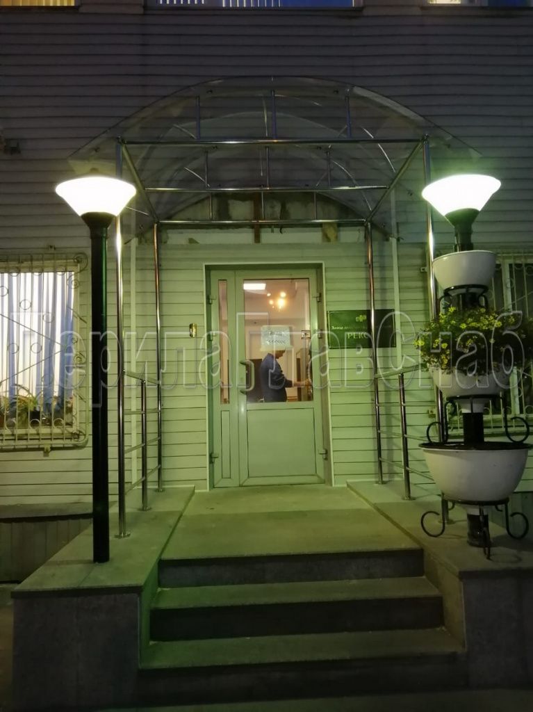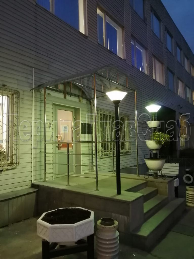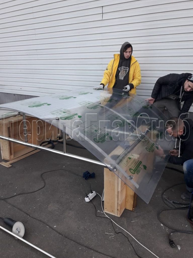 Конструктив: Козырёк на каркасе из нержавеющей стали AISI 304 с дополнительными поручнями на крыльце, навес выполнен из монолитного поликарбоната 8.0 мм.