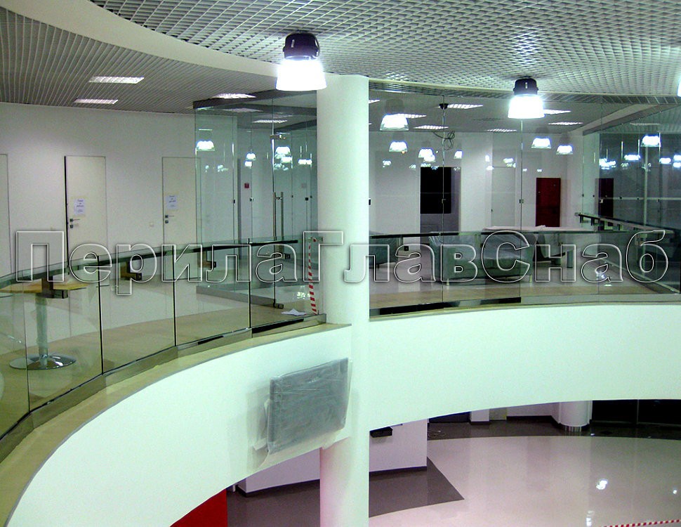 Ограждение со стеклом по кругу атриума.Оригинальный элемент совершенно уникальных для данного типа ограждений — поручень на выносных элементах установлен сбоку стекла.На заднем плане хорошо видны цельностеклянные офисные перегородки.