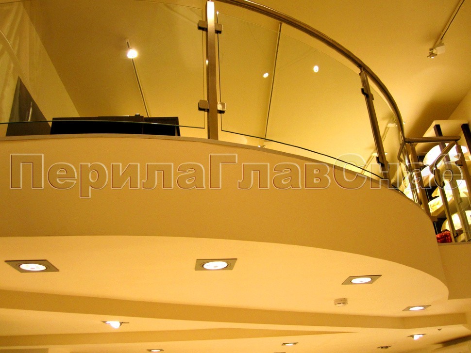В числе наиболее сложных типов в галерее представлено ограждение с использованием моллированного или как его ещё часто называют «гнутого» стекла по радиусу поручня.