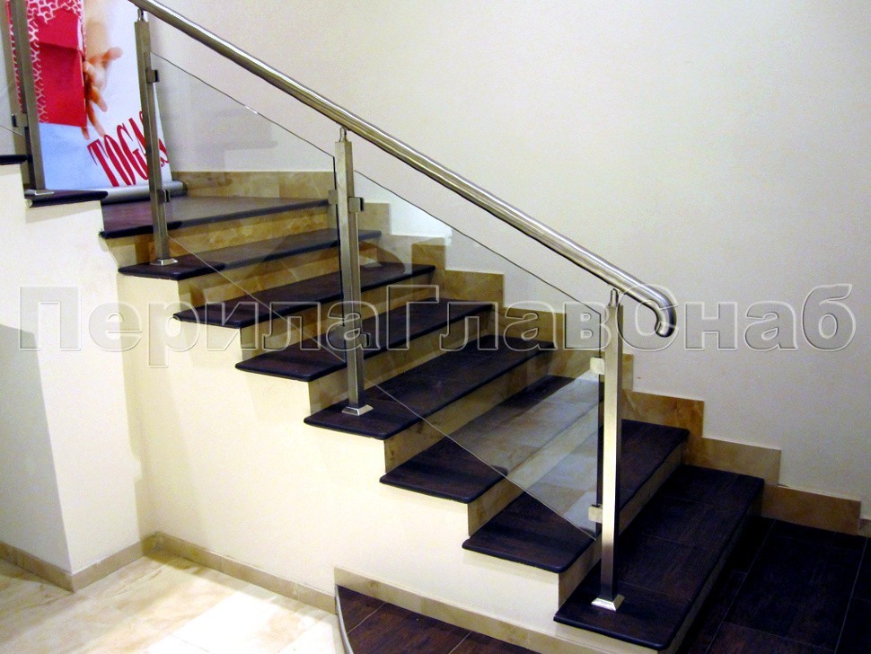 В том числе использовались наклонные ограждения со стеклом на квадратных стойках, изготовленных специально под проект заказчика.