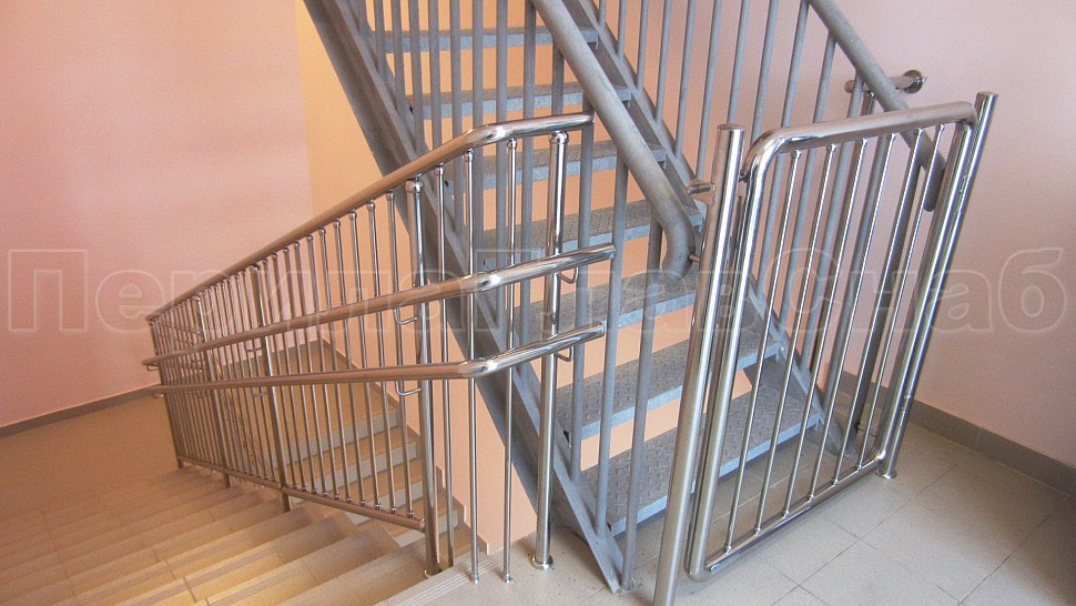 • У лестницы же стойки имеют высоту чуть большую — 950 мм, труба Ø38 мм. Устанавливаются на расстояние через две ступени в третью, на прямых участках не более 1000 мм друг от друга. Наконечник выполнен в декоративном стиле в виде сферы. Для большей безопасности установлены семь ригелей между стойками, и, в отличие от пандуса, они крепятся к стойке сваркой снизу и установлены вертикально. Поручень двойной диаметром 38 мм установлен на высоте 700 мм и 900 мм, крепится к стойке на выносных держателях и на поворотах завязан бубликом.