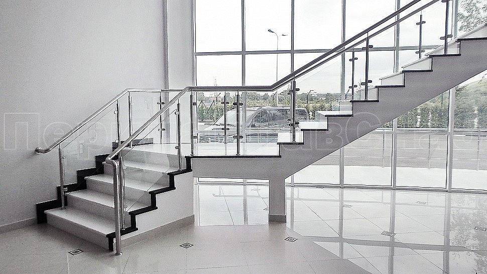 Складскому комплексу с административно-бытовыми помещениями было установлено ограждения двух внутренних центральных лестниц и атриума из полированной нержавеющей стали AISI 201 со стеклом. Высотой 950 мм и 1200 мм, стойки диаметр 38 мм, крепление сверху методом алмазного бурения диаметром 42 мм на глубину 70 мм, устанавливаются через две ступени в третью, наконечник стойки штырь, низ стойки декоративная крышка диметр 56 мм; стекло прозрачное закаленное 8 мм, крепится на зажимных стеклодержателях; поручень диметр 50,8 мм, окончание поручня заглушка. Крепление нержавеющих элементов ограждения между собой точечная аргонно-дуговая сварка, с последующей зачисткой и полировкой. г. Москва, ЗАО, внутригородское муниципальное образование Ново-Переделкино, промзона Орлово, проектируемый проезд 635.