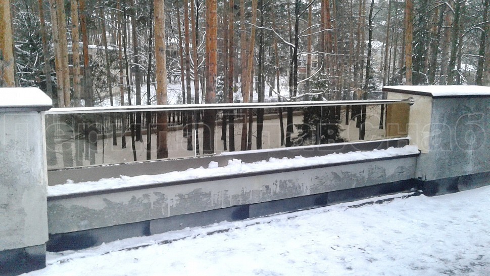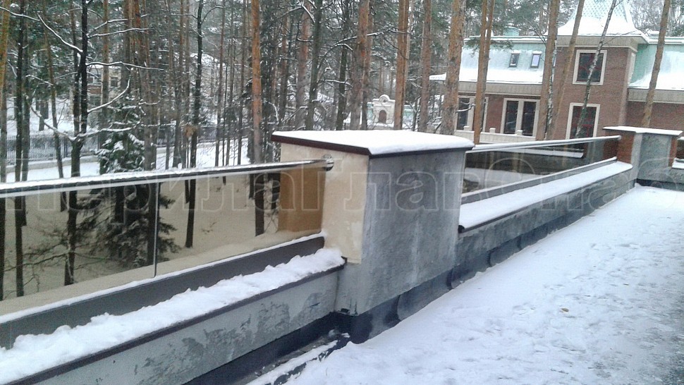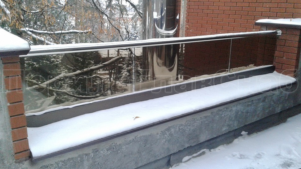 Было произведено ограждение кровли и полированной нержавеющей стали марки AISI304, высотой 600мм от уровня парапета, с установкой на парапет через проставки с каленым стеклом триплекс. Устанавливается в алюминиевый профиль цветом шоколадная бронза, сам профиль крепится в парапет на анкера. Сверху на стекло крепится поручень с пазом диаметром 42мм из нержавеющей стали марки AISI 304, поручень уходит в стену через фланец. Крепление между собой нержавеющих элементов ограждения произведено точечной аргонно-дуговой сваркой, длина швов 2мм, в последствие зачищены и отполированы. Данное ограждение отлично вписывается в интерьер здания, а качественная сталь не дает осечки даже в период холодов и повышенной влажности.