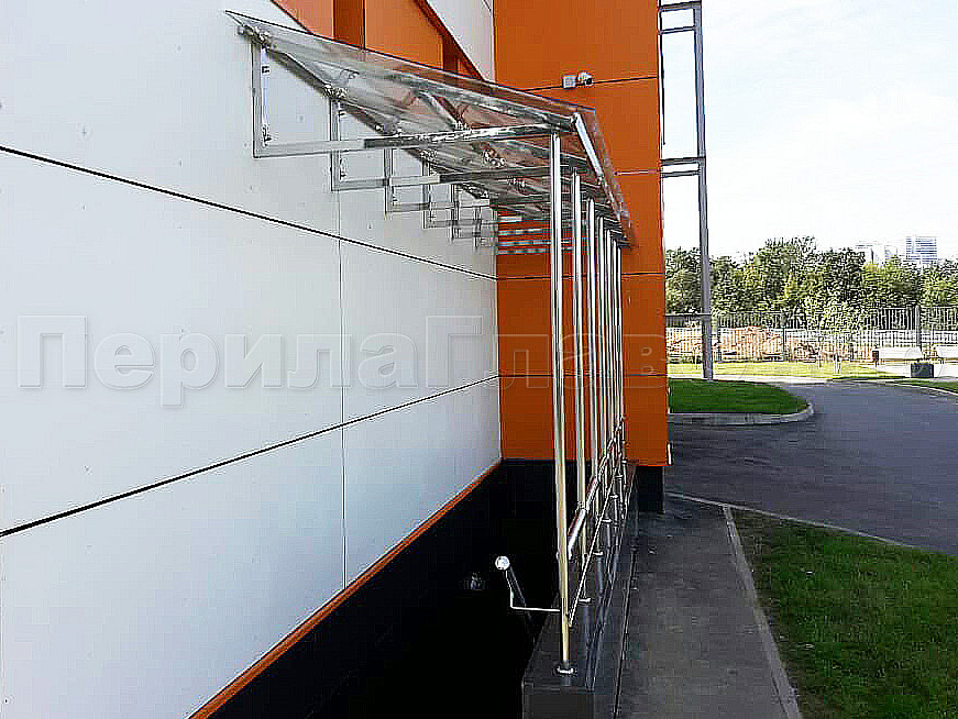 Здание очень яркое и заметное, а наши козырьки очень выгодно сочетаются с оранжевым цветом здания. Конструктив: козырек односкатный (от стены) над приямком из полированной нержавеющей стали марки AISI-304. Рама труба 40х40х1,5мм. Опорные стойки на ограждения приямков труба Ф50,8х1,5мм опираются на стойки ограждения.
