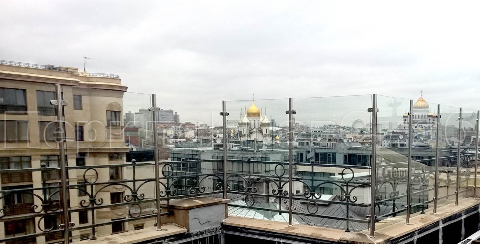 Ограждения для лестницы с поручнем на выносе с зажимными стеклодержателями и квадратными стойками