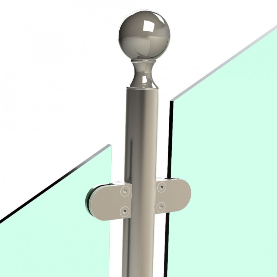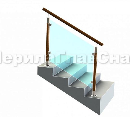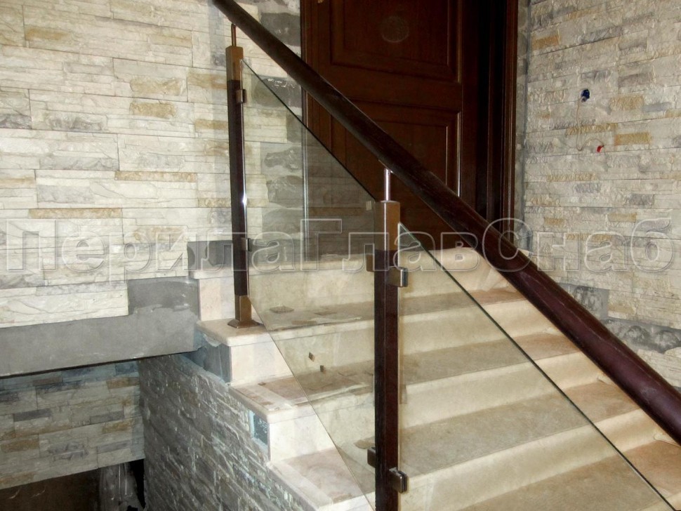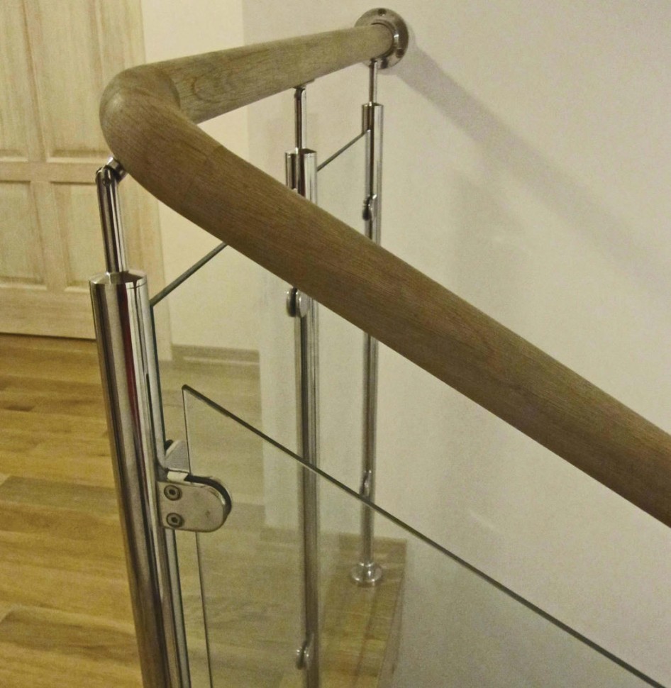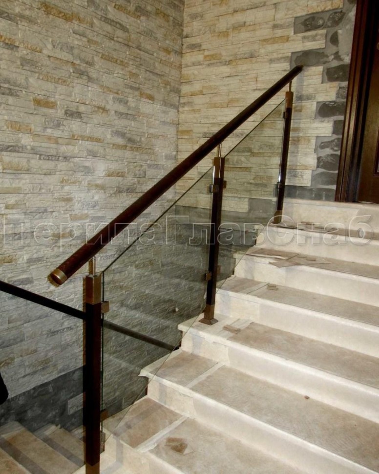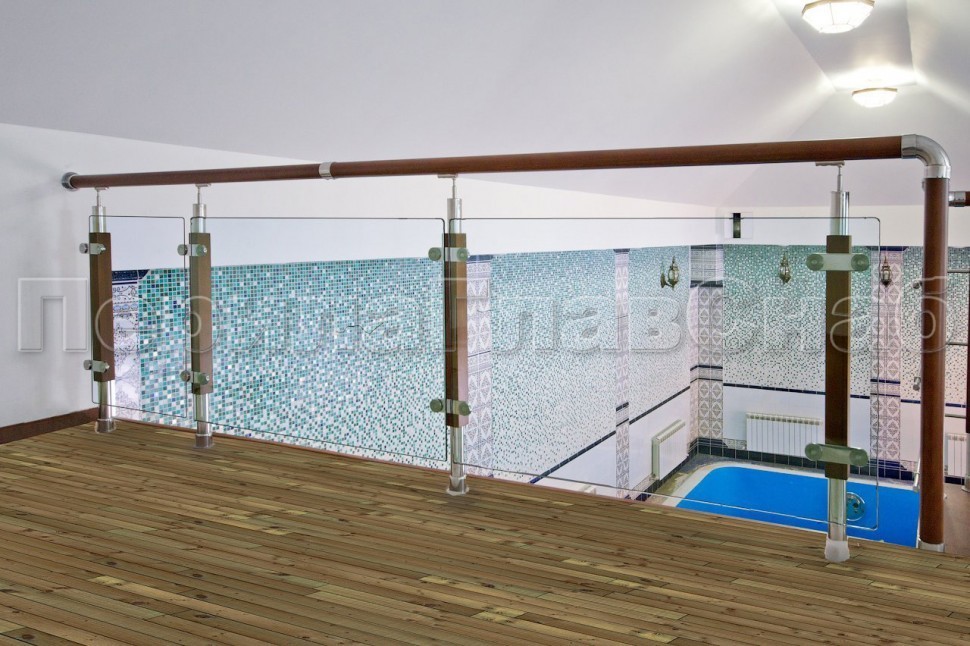 Записаться на встречу Ограждение с круглым деревянным поручнем с зажимными стеклодержателями и стойками с деревянными вставками