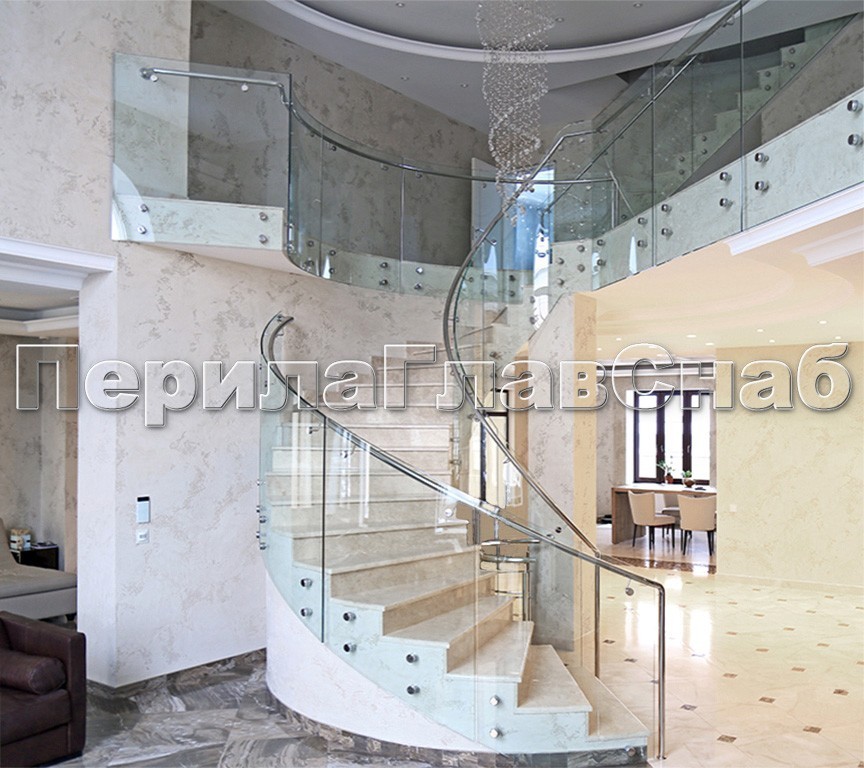 - на выносных держателях к стеклу, прокатан по радиусу на балюстраде, имеет конструкцию винта на лестнице